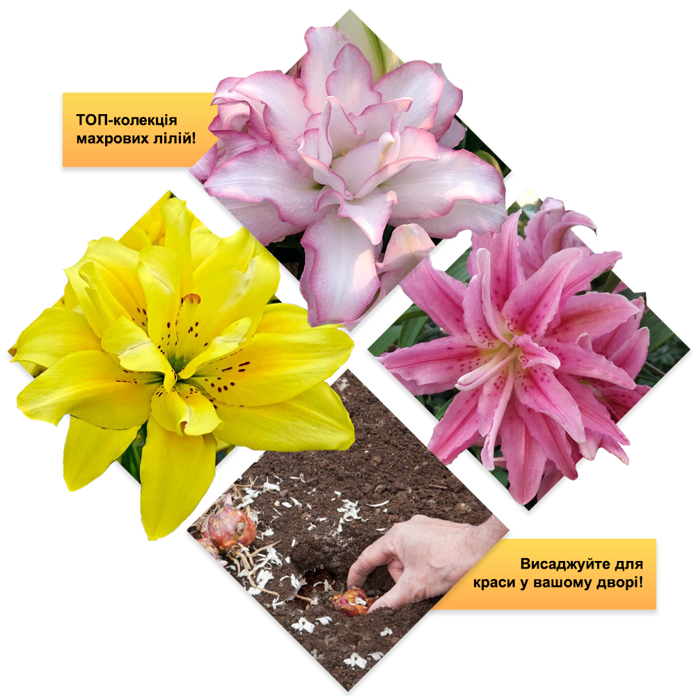 Колекція махрових лілій, до якої увійшли ТОП-3 найкрасивіші сорти, які квітнуть від кінця весни до середини вересня!