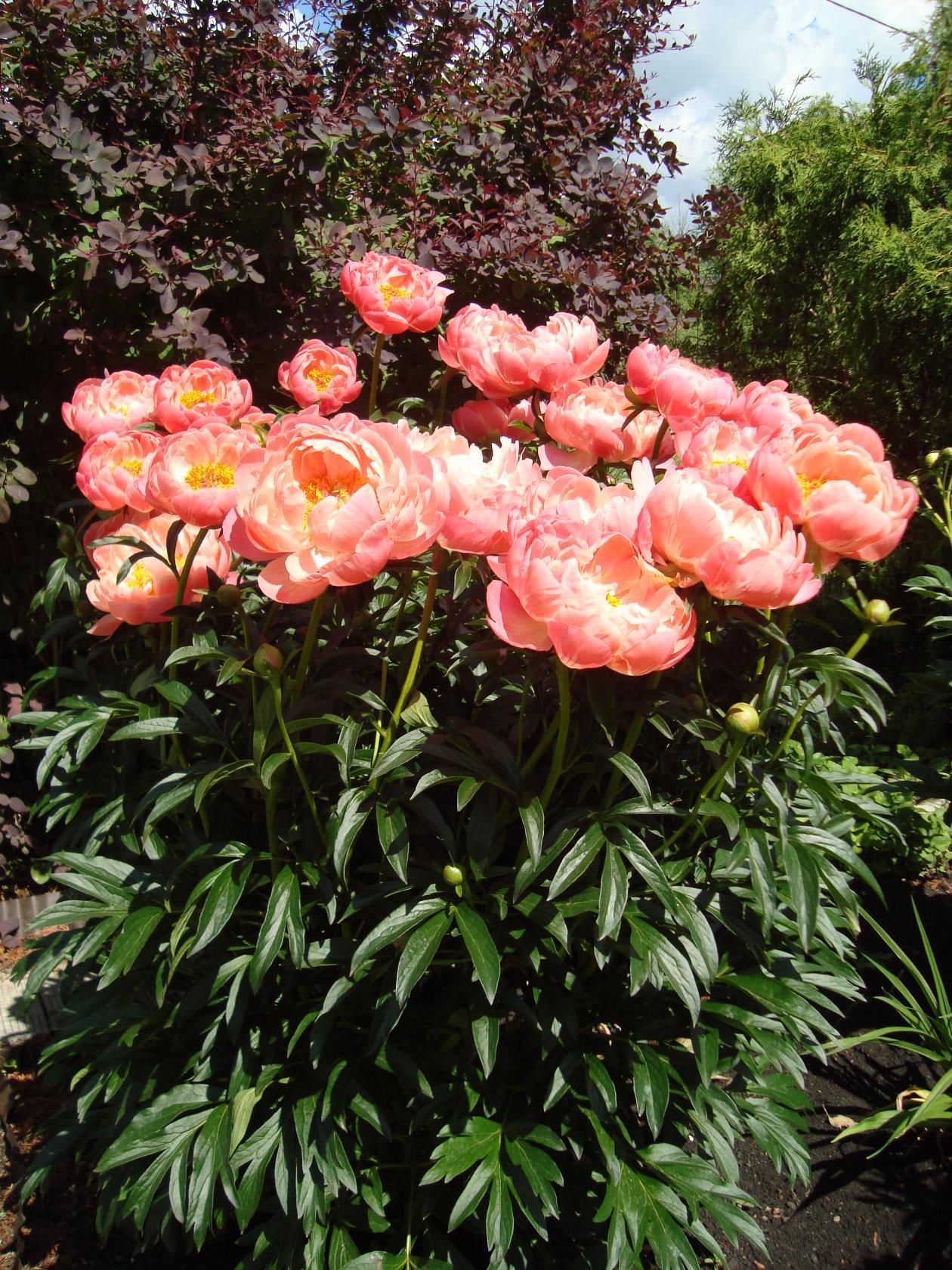 На повному сонці півонії змінюють колір — з коралового до насиченого жовтого.